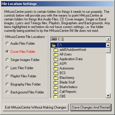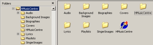 Folder Metadata: HMusicCentre works with files being held in specially named folders that are defined in the HMusicCentre.ini file, it has seven folder it needs to know about for Audio files, Cover images, Singer images, Biographies, Playlists, Background images and Lyrics. The example below shows how these are arranged on my HMusicCentre system: