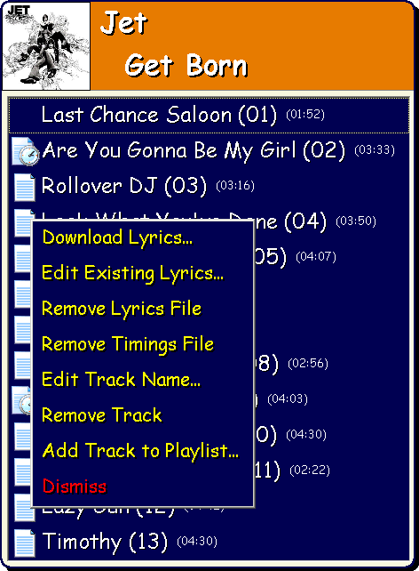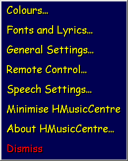 There are four context menus within HMusicCentre - these are accessed by right-clicking the mouse in different areas of the screen. The menus allow access to some more detailed settings and configuration possibilities for HMusicCentre...